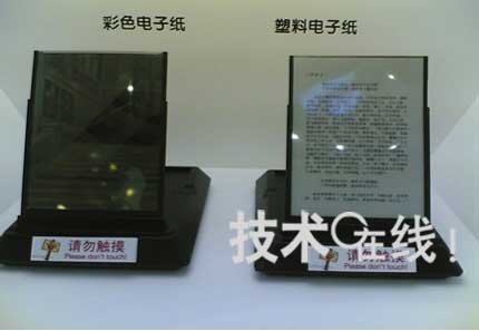 此次三星帶來了獨自開發的塑料和彩色電子紙。塑料電子紙為16階色,彩色電子紙只能顯示4%的NTSC色域,所用材料為塑料,并將門電路集成到塑料基板上,大小為10.1英寸。塑料電子紙和彩色電子紙的厚度分別為0.7mm和0.5mm。據三星的工作人員介紹,其電子紙均從E ink采購電泳層,然后生產出半成品后,銷售給其他電子書廠商。
