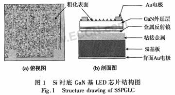 從結構圖中看出,Si襯底芯片為倒裝薄膜結構,從下至上依次為背面Au電極、Si基板、粘接金屬、金屬反射鏡(p歐姆電極)、GaN外延層、粗化表面和Au電極。這種結構芯片電流垂直分布,襯底熱導率高,可靠性高;發光層背面為金屬反射鏡,表面有粗化結構,取光效率高。[page]