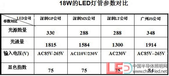 通過(guò)上面的表格可以看出,以上我們?nèi)我膺x擇的四家公司的LED燈管的相關(guān)結(jié)果數(shù)據(jù)有的參數(shù)會(huì)有會(huì)有一定的差別,選用LED光源的數(shù)量從144-168顆,光通量也從650-940LM,相差的范圍有290LM之多,輸入的電壓有寬電壓,也有窄電壓。顯色指數(shù)基本在Ra=75左右,國(guó)家LED燈具標(biāo)準(zhǔn)出臺(tái)后會(huì)有一個(gè)標(biāo)準(zhǔn)和規(guī)范。以上為各廠家自行測(cè)試結(jié)果(如上圖所示)
