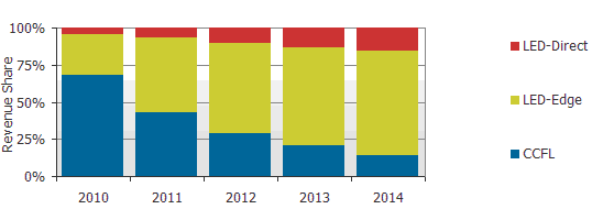 DisplaySearch預估2010年LED背光液晶電視將占所有液晶電視出貨的20%,大約90%的LED背光液晶電視是使用側光式背光源。在2011年由于LED零組件供應補足且價格下滑,LED背光液晶電視將在2012年成為主要的應用技術。隨著節能觀念提高與相關規定出臺,以及輕薄設計流行,CCFL到LED背光源液晶電視轉換速度將非常快速。