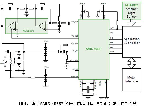 設(shè)計人員可以采用安森美半導(dǎo)體的AMIS-49587電力線載波(PLC)調(diào)制解調(diào)器、PLC線路驅(qū)動器NCS5650和諸如NOA1302這樣的環(huán)境光傳感器,基于電力線輕易地構(gòu)建聯(lián)網(wǎng)型LED街燈智能控制系統(tǒng)(參見圖4)。其中,安森美半導(dǎo)體的環(huán)境光傳感器包含的輸出類型,如NOA1302和NOA1305提供的是數(shù)字輸出,而NOA1211為模擬輸出。這些光傳感器的工作電流極低,在100流明光輸出條件下分別僅為58 μA、550 μA和115 μA,因而對系統(tǒng)能效的影響極小。