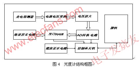 為了精確測量光通量,把光源放在積分球中。經過V(λ)校準的光電探測器接受光信號,其輸出的電信號經過放大轉換電路,將光電探測器輸出的光電流信號轉換成較大的電壓信號,利用AD轉換器進行采樣。由于單片機讀取和存儲數據速度較慢,故而采用了雙口RAM和地址發生電路,使得光度計能夠在采用時自動對數據進行存儲。單片機則在所有采樣過程執行完畢后,再從雙口RAM內讀取數據,并發送給微機顯示處理。系統結構圖和實物連接圖如下。