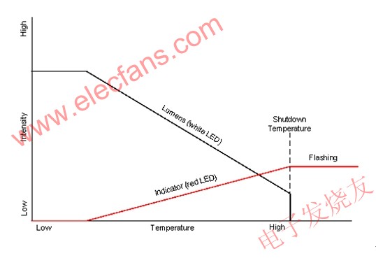 圖2所示系統(tǒng)中的流明下降是通過低功耗的紅色LED指示的。當(dāng)系統(tǒng)處于最大流明輸出時,紅色LED關(guān)閉;當(dāng)LED燈溫度升高時,流明輸出則會下降,而流明輸出下降時,紅色LED即會開啟。隨著流明輸出不斷下降,紅色LED的強度會相應(yīng)增加。當(dāng)流明輸出下降到其最低強度時,紅色LED將會完全開啟。
