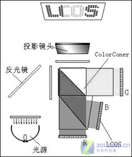 投影機技術基本顯影原理相仿,主要是由鹵素燈、氙氣燈等發光,集光至面板,將面板的影像經反射或透射投射出影像,再經過分光、合光系統,最后將影像投射到屏幕顯像。LCOS(LiquidCrystalonSilicon)是一種全新的數碼成像技術,它采用半導體CMOS集成電路芯片作為反射式LCD的基片,CMOS芯片上涂有薄薄的一層液晶硅,控制電路置于顯示裝置的后面,可以提高透光率,從而實現更大的光輸出和更高的分辨率。