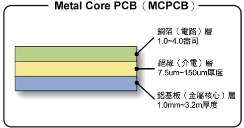 為了改善電路板層面的散熱,因此提出了所謂的金屬核心的印刷電路板(MetalCorePCB;MCPCB),即是將原有的印刷電路板附貼在另外一種熱傳導效果更好的金屬上(如:鋁、銅),以此來強化散熱效果,而這片金屬位在印刷電路板內,所以才稱為「MetalCore」,MCPCB的熱傳導效率就高于傳統(tǒng)FR4PCB,達1W/m.K∼2.2W/m.K。