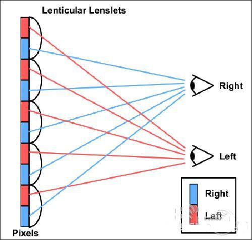 柱狀透鏡(LenticularLens)技術(shù)也被稱為雙凸透鏡或微柱透鏡3D技術(shù),其最大的優(yōu)勢便是其亮度不會受到影響。柱狀透鏡3D技術(shù)的原理是在液晶顯示屏的前面加上一層柱狀透鏡,使液晶屏的像平面位于透鏡的焦平面上,這樣在每個(gè)柱透鏡下面的圖像的像素被分成幾個(gè)子像素,這樣透鏡就能以不同的方向投影每個(gè)子像素。于是雙眼從不同的角度觀看顯示屏,就看到不同的子像素。不過像素間的間隙也會被放大,因此不能簡單地疊加子像素。讓柱透鏡與像素列不是平行的,而是成一定的角度。這樣就可以使每一組子像素重復(fù)投射視區(qū),而不是只投射一組視差圖像。