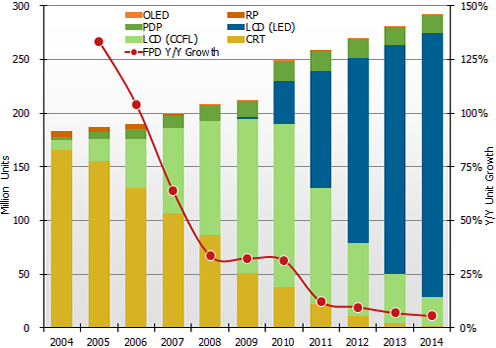 • 預計總體液晶電視出貨量將穩步增長,到2014年達到2.7億臺