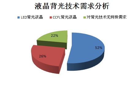 根據賽迪網對350位網友所作的調查顯示,在購買顯示器的時候,考慮LED產品的有182位,占52%。依舊會考慮CCFL產品的有91位,占26%,而表示不關心背光技術的有77位,占22%。而在1年多以前類似的調查當中,表示會選購LED產品的用戶比例還不足25%。由此,很多廠商甚至已經在產品線上實現了全部LED化。而隨著LED產品價格的進一步走低,在未來一到兩年之內,CCFL產品很有可能會被完全取代。