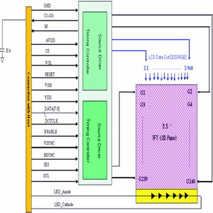 從TFT-LCD的切面結(jié)構(gòu)圖(圖1)可以看到LCD是由二層玻璃基板夾住液晶組成的,形成一個(gè)平行板電容器,通過(guò)嵌入在下玻璃基板上的TFT對(duì)這個(gè)電容器和內(nèi)置的存儲(chǔ)電容充電,維持每幅圖像所需要的電壓直到下一幅畫面更新。液晶的彩色都是透明的必須給LCD襯以白色的背光板上才能將五顏六色表達(dá)出來(lái),而要使白色的背光板有反射就需要在四周加上白色燈光。因此在TFT-LCD的底部都組合了燈具,如CCFL或LED。