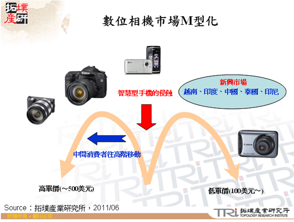 據(jù)拓墣研究所,受到消費(fèi)族群往高端相機(jī)產(chǎn)品移動(dòng),以及新興市場(chǎng)所帶動(dòng)的低端消費(fèi)型相機(jī)銷(xiāo)售量,造成數(shù)碼相機(jī)市場(chǎng)兩端銷(xiāo)售狀況高起,市場(chǎng)呈現(xiàn)M型化的現(xiàn)象,2011下半年數(shù)碼相機(jī)的銷(xiāo)售量將會(huì)成長(zhǎng)到7,900萬(wàn)臺(tái)。
