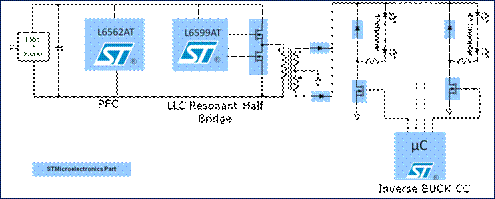 電源電路的最大輸出功率達到130W (48V,2.7A),該電路由兩級電路組成:基于L6562AT的前端功率因數校正器(PFC)和基于L6599AT的LLC諧振轉換器