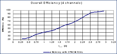 為了全面地分析采用反向降壓轉換器拓撲實現的數字電流控制器,圖4對能效與電流負載進行了對比分析。在全負載時,四條通道可實現 97%的總能效,這可滿足主要的節能要求。