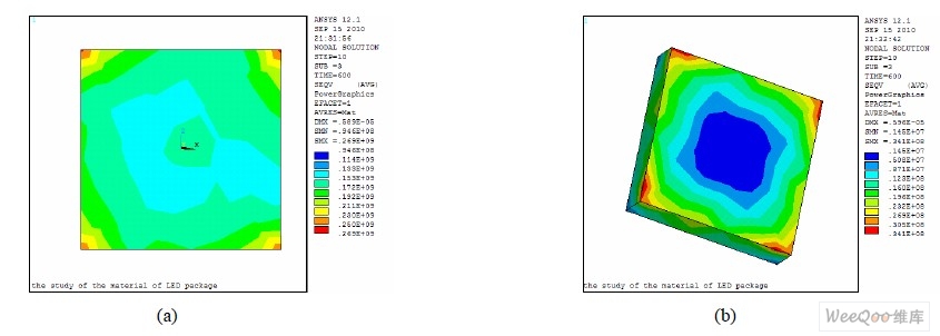 圖6 Lumileds 1 W LED 鍵合層(a)和芯片(b)的等效熱應力分布