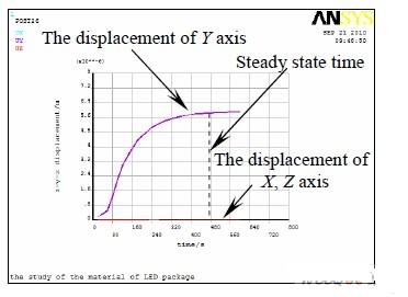 芯片頂面中心節點的位移隨時間變化曲線如圖7 所示,X 和Z 方向位移近似為零,Y 方向的位移隨著時間和溫度場的變化而不斷變化(Y 向為器件縱向即溫度傳遞方向),在光源點亮500 s 左右后,溫度場進入穩定狀態,此時芯片應變量達到最大6.3 μm,與瞬態溫度場的變化相符。