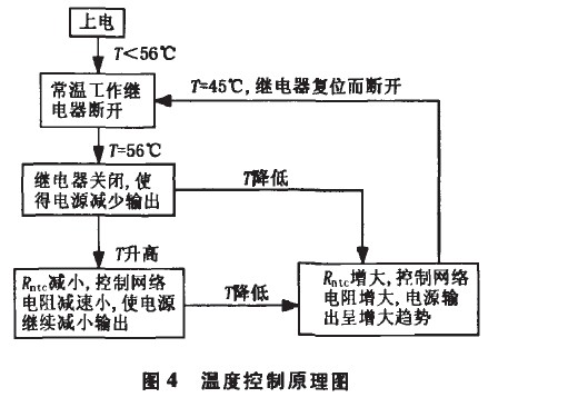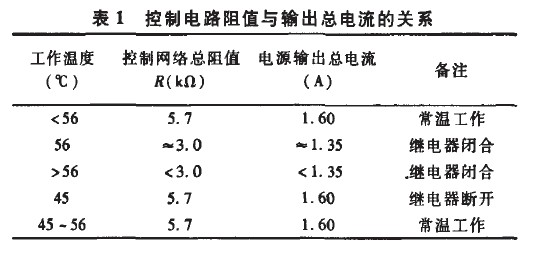 處于斷開狀態,此時控制電路中只有W1起控制作用,設定常溫工作總電流恒定為1.60A。當繼電器溫度上升到56℃時,Kt自動閉合,整個控制電路開始工作,以減小恒流電源的輸出;當溫度降低到45℃時,Kt自動斷開,電源額定輸出。該過程可用圖4表示,圖中T為Kt的溫度,Rntc為NTC的阻值。
