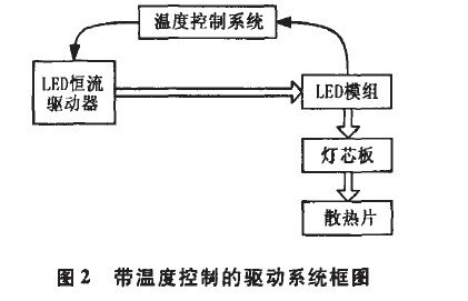 此方案通過控制驅動器的輸出電流來實現對LED燈的溫度控制。圖2為恒流驅動器驅動LED燈框圖,驅動器輸出到LED模組,LED模組上產生的熱量通過良好的導熱材料傳導到燈芯板,最后經由散熱片散熱到大氣中。當外界散熱環境惡劣時,LED模組的溫度會達到溫度控制系統設定的溫度,得到反饋的信息后,驅動器減少輸出,達到限制并降低LED模組溫度的目的。