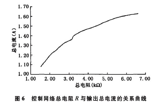 控制電路阻值與輸出總電流的關系列于表1,其中R為控制電路的等效電阻。經過在恒溫箱中測試,每2℃記錄1組數據得到如圖5所示的NTC熱敏電阻的溫度一阻值曲線。該方案中,驅動電源通過接收到反饋的溫度信息來控制輸出電流,根據圖5中NTC的溫度與阻值的關系,只要找到輸出電流隨總阻值的變化關系(如圖6所示),再進行適當的電阻匹配,便可找到溫度與驅動器輸出電流的關系。