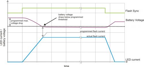 如果閃光燈驅(qū)動(dòng)器本身能夠防止電池電壓下降過(guò)多,那么就可以保持較小的安全界限。通過(guò)使用一個(gè)受控轉(zhuǎn)換率升高 LED 電流,并在上升期間持續(xù)監(jiān)控電池電壓可以實(shí)現(xiàn)這一目標(biāo)。