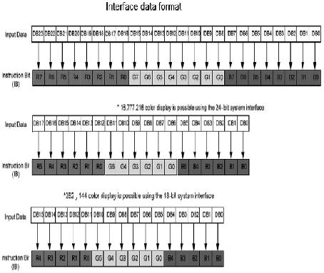 圖4 顯示了圖片的數據是怎樣實現灰階的。第一個是典型的24bit 顯示接口,數據通過GRAM 后轉換成8bit Red、8bit Green 和8bit Blue.同理,18bit 的顯示接口將數據轉換成RGB 666,16bit 的顯示接口將數據轉換成RGB 565,繼而混色成0到255 灰階的不同色彩。
