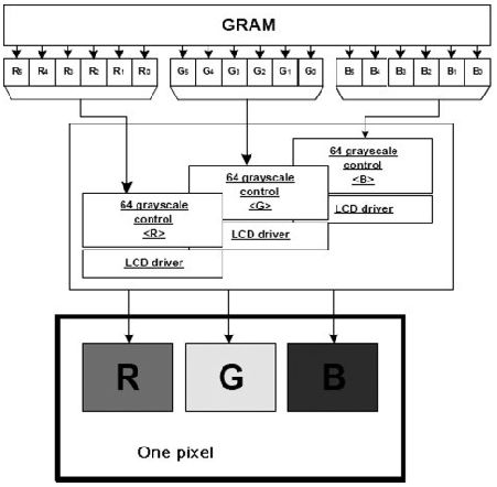 通過嚴格控制和改變液晶上所施加的電壓,每種子像素呈現不同的灰階。在結合了這三種子像素后,可以得到一個可以顯示不同顏色的顯示屏。