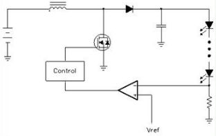 圖中顯示了一個基本的電感升壓電路,其中控制器(Control)給出了一個PWM開關(guān)信號來控制大功率開關(guān)管,后者在導(dǎo)通時對電感充電,而在斷開時電感中的能量就對電容充電。經(jīng)過幾次開關(guān)以后就可以把輸入電壓泵至更高的電壓,從而完成升壓的任務(wù)。改變PWM信號的工作比就可以改變其輸出電壓。為了保持輸出電流的恒定,就要求測量輸出電流值,這是靠一個和LED串聯(lián)的小電阻來測量的。這個電阻上的電壓就和一個參考電壓相比較,比較所得出的誤差信號就送去控制器用以改變PWM信號的工作比,這樣就實(shí)現(xiàn)了一個閉環(huán)自動控制,以控制其輸出電流為恒定。