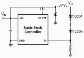 通常儲能電感是和LED串聯(lián),開關(guān)導(dǎo)通時,電感儲能;開關(guān)斷開時電感通過二極管繼續(xù)有電流流通。由于輸出電壓是輸入電壓減去電感電壓,所以是降壓型。LED中的電流經(jīng)過檢測電阻測量以后反饋回控制器。來控制PWM的工作比,以實(shí)現(xiàn)恒流的控制。