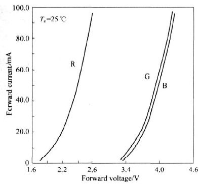 圖1 和圖2 反映了一組R、G、B 3 種LED 的正向電壓VF與正向電流IF 以及IF 與亮度L 間的關系。可以看出,超過門限電壓后,隨著VF 的增加, IF 先是緩慢增加而后便急劇增加。