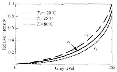 但此方法將損失低灰度級的亮度,降低了圖像的灰度級,即降低了圖像顯示色彩。為了不減少低級灰度且保證對亮度的調整,提出一種針對每個溫度段采用不同的Gamma 參數來調整相關色彩亮度的技術,以補償環(huán)境溫度對器件的影響。系統針對不同的RGB 的基色設置其獨立的Gamma 反校正參數。
