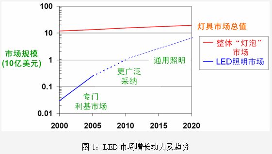 高亮度LED的光輸出、能效及成本正在迅速改善,使其應用范圍不斷擴大。根據LED的工作電壓可以劃分為三個功率等級:0.9V至7V(手機和移動設備)、7V至60V(汽車和LCD背光)和60V至700V(通用照明)。這當中市場成長潛力最大的是汽車、LCD背光和通用照明。汽車應用主要包括氖燈替代、應急車輛燈、組合尾燈、儀表盤照明、信息娛樂、內部照明、中央高位剎車燈、前照燈、停車燈等;LCD背光主要包括大屏幕液晶電視、中等屏幕的筆記本、GPS、相框、上網本等;通用照明主要有離線LED驅動器/鎮流器、街道/區域照明、替代燈泡、替代熒光燈、交通信號燈、工作照明、景觀照明、建筑物照明等。不難看出,今后LED照明將逐步進入到更多的應用領域。