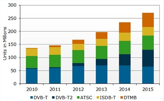 “到2015年,DVB-T和DVB-T2電視的出貨量將處于相當(dāng)水平,”Gray繼續(xù)說到,“俄羅斯和印度政府轉(zhuǎn)向T2的決定給行業(yè)注入強(qiáng)心劑,并將推動成本下降,促進(jìn)新一輪電視應(yīng)用。”
