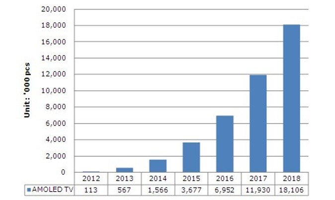 據NPD DisplaySearch分析,2011年OLED面板產值預計達40億美金,約為所有平板顯示器產值的4%;2018年則將創造超過200億美金產值,達到了所有平板顯示器產值的16%?此外, OLED應用在照明上也自2011年開始起飛,OLED照明預計到2018年將達到60億美金產值。NPD DisplaySearch預測 AMOLED TV將于2017年達到1千萬臺以上的規模。雖然在AMOLED TV面板量產初期會有規模經濟不夠、量產穩定性不夠以及成本過高等問題,但在電視品牌廠商追求產品差異化的動機之下,預計將會有策略性的AMOLED TV訂價方式,以刺激終端市場消費者的購買動機。