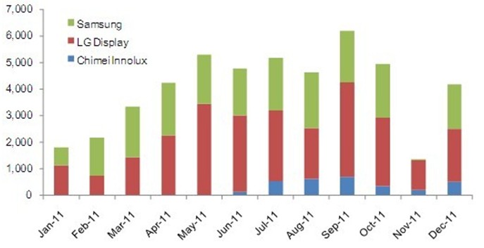 2011年9.7" iPad平板電腦面板出貨達到了4千8百萬片。雖然面板廠商之前的出貨預期更高,但受到了第四季度庫存調整的影響而最終無法達到2011年全年5千萬片以上的目標。2011年的9.7寸面板出貨以XGA(1024x768)規格為主,亮度要求為400nits以上;且采用了IPS或FFS規格的廣視角技術,而主要的面板供貨商為韓國的三星、LG Display與臺灣的奇美。根據NPD DisplaySearch每月TFT LCD面板出貨報告(Monthly TFT LCD Shipment Database),三家9.7寸面板供貨商在2011年的出貨各有千秋,如下圖所示。