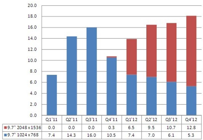NPD DisplaySearch 指出,展望2012年,9.7寸iPad 面板出貨預計將可達6千5百萬片以上,主要驅動力來自于新的iPad機種的推出、既有iPad面板的成本再降低、面板分辨率的再提升以及新面板技術(例如薄化玻璃、透明金屬氧化物晶體管TFT LCD等等)的采用。