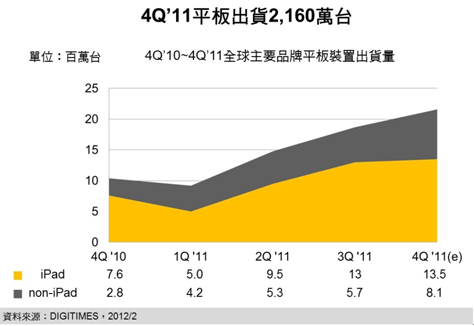 盡管多家業者受庫存與新品計劃延遲所困,但在iPad與低價Tablet強攻下,2011年第4季全球品牌Tablet出貨達2,160萬臺,季成長15.8%,年成長107.5%,高于原先估計。總結2011年,全球品牌Tablet出貨達6,328萬臺,iPad獲得約65%占比,Android Tablet則約30%。