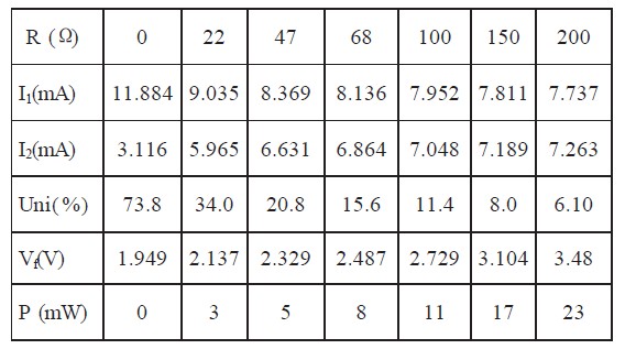 計算機利用對分法算出了在總電流為15mA,外加偏置電阻(R)為R4=R5=0 , 22 , 47 , 68 , 100 , 150, 200 (Ω) 時, D1 和D2 的電流( I1 和I2) 、亮度均勻性( Uni)、正向電壓(V5) 、以及偏置電阻帶來的功耗(P)。