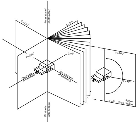 配光曲線儀可分為A-α、B-β、C-γ三種形式,詳見圖6~8。為確保量測時的光源擺放姿態即為使用時的姿態,僅有C-γ符合需求,LM-79因此規定僅可使用C-γ形式的配光曲線儀。C-γ型配光曲線儀包含移動偵測器探頭及移動反光鏡的類別。