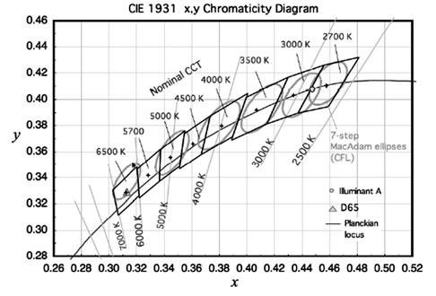 此規范包含美國國家標準中針對固態照明產品的光色特性規格定義,適用于室內使用的燈具,不包括戶外燈具。其中,重點有兩部分,其一是定義相對色溫(CCT)的分級,其次是針對同一相對色溫標稱等級其允許的色溫變異范圍作定義。