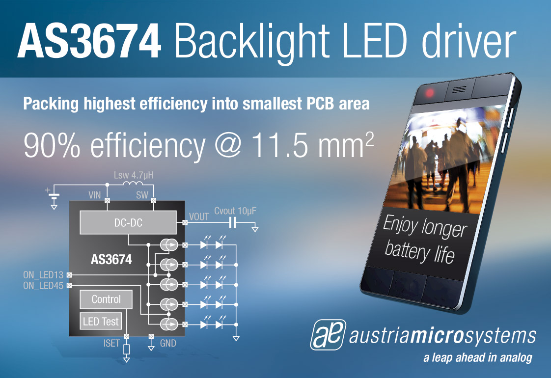 全球領(lǐng)先的高性能模擬IC設(shè)計(jì)者及制造商奧地利微電子公司(SIX股票代碼:AMS)宣布推出應(yīng)用于智能手機(jī)LCD顯示屏的AS3674及AS3490兩款LED背光燈驅(qū)動(dòng)器芯片。新品具有業(yè)內(nèi)最高效能,峰值可達(dá)90%,包括DC-DC轉(zhuǎn)換器和電流源。PCB封裝僅為11.5 mm2 ,并只需4個(gè)外接組件。AS3674及AS3490非常適合應(yīng)用于智能手機(jī)和其他將空間列為首要需求的移動(dòng)設(shè)備。