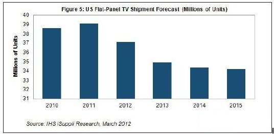 據IHS iSuppli公司的美國電視市場追蹤報告,2012年美國市場的平板電視出貨量預計降到3710萬臺,比2011年的3910萬臺減少5%。去年出貨量較2010年的3860萬臺微增1%。