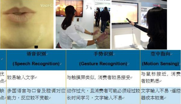 目前在許多電視機廠商與電視品牌的努力之下,已經出現了三個通用的人機界面解決方案:語音識別 (Speech Recognition),手勢識別 (Gesture Recognition)和動作感應 (Motion Sensing)。每種方式均有其優點和缺點,簡單分列如下。