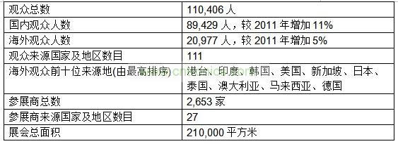 第十七屆「廣州國際照明展覽會」展覽面積達21萬平方米,規模較2011年增長5%,參展企業2653家,比上屆減少9%,參展企業來自全球27個國家和地區。本屆展會觀眾數目同創新高,吸引了110,406名觀眾,較2011年增長10%,分別來自111個國家及地區,其中國內專業觀眾89,429人,較2011年增加11%,海外專業觀眾20,977人,較2011年增加5%,海外觀眾前十位來源地分別是港澳臺地區、印度、韓國、美國、新加坡、日本、泰國、澳大利亞、馬來西亞和德國。大會同期舉辦的各類技術研討會、產業高峰論壇、產品推介會、交易節等高水平會議、論壇交流活動多達110多場次,較去年增加10場,亦創新高。