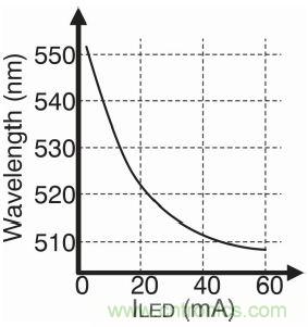 這時候,需要考慮電流變化對LED光輸出波長值的影響。改變波長就意味著改變人眼看到的色彩。圖4是綠色LED燈的實例。通常在業界,510nm 廣泛代表綠色。因此,大部分LED燈制造商所設計的LED燈產品在最大額定電流下都具備510nm的波長。在圖4中,隨著LED電流的升高,波長可達到510nm。獲得綠色的最佳方法是盡量使燈的驅動電流接近最大額定值。這也就說明了為什么使用數字控制比使用模擬控制好。