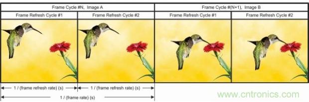 為滿足更快運行這一要求,很多LED顯示系統都在一個幀周期內反復顯示相同的影像,稱為幀刷新率。圖10是幀速率與刷新率的關系。只有兩張幀影像:A 和 B。每個幀重復“影像 x”兩次。因而本實例“幀刷新率”= 2 ד幀速率”。