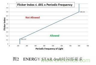 化,人眼到人腦對這一變化產(chǎn)生的主觀反映。通常閃爍按人的感覺分為可見閃爍和不可見閃爍。頻率大于100Hz時,人眼感受不到閃爍現(xiàn)象,但仍會造成眼睛疲勞,頭痛等,這就是頻閃效應(yīng)。普遍認(rèn)為500Hz以內(nèi)都存在該效應(yīng)。對此,美國能源之星在調(diào)光性能的要求中規(guī)定了閃爍需滿足的條件,使用于所有燈具。如下圖所示: