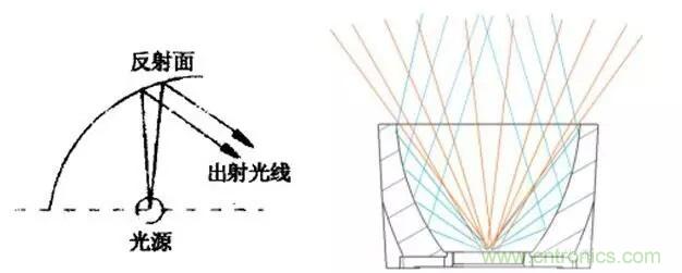 例如我們希望得到一個超窄光束角,如果使用鹵素燈珠(廢話熒光燈當然不行了…),需要計算一個拋物線反射面,抓取燈珠往反射器方向這一半的光,變成平行光發出,同時還要遮蓋掉燈珠往外方向的光,以避免影響配光曲線(可參考QR111的結構,金鹵燈原理相同)。