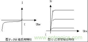 其實,從二極管PN的反向截止特性曲線上很容易看出,只要將這個特性曲線轉過180度,如圖F所示,它的情形與三極管的輸出特性非常相似,三極管輸出特性如圖G所示。這說明了二極管與三極管在原理上存在著很必然的聯系。所以,在講解方法上選擇這樣的切入點,從PN結的偏狀態入手講三極管,就顯得非常合適。而且,這樣的講解會使問題變得淺顯易懂生動形象,前后內容之間自然和諧順理成章。
