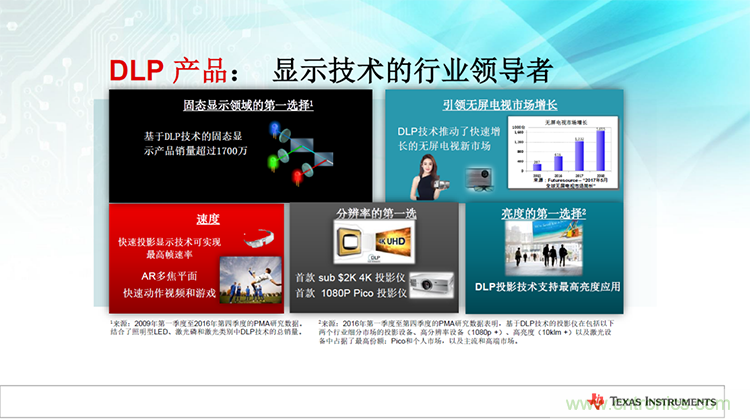 “在顯示應用領域,DLP技術涵蓋范圍非常廣,從小巧的口袋型顯示器到高端大型的數字影院,TI一直保持大量的產品和技術創新。”Ane Sacks女士在會議中介紹到,“如今,TI已經能夠實現最高幀速率和最高亮度的快速投影顯示技術,面向快速動作視頻和游戲市場;在面板分辨率上推出了入門級的4K平臺,與此同時在1080P上也有十足的創新,推出了超高性價比的1080p Pico解決方案,未來市場潛力巨大。”