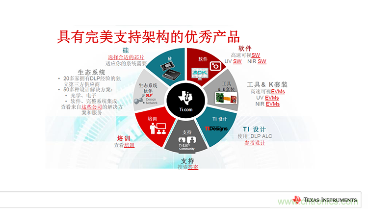 “為加速滲透民用主流市場,TI不僅推出了性能優異的產品,還建立了一流的支持架構,以借助廣大TI用戶加快產品面市。”Ane Sacks女士還表示,“針對TI的IC和DLP芯片組,TI可以提供軟件、工具套件、參考設計、工程社區交流、技術培訓以及完善的DLP生態系統等技術支持,包含20多家擁有DLP經驗的獨立第三方供應商以及50多種光學、電子、軟件等方面的設計解決方案,能夠將最新的創新、產品和應用及時、快速地傳遞給客戶。”