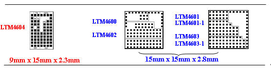 由于 LTM4604 以較低電壓和較低功率工作,因此這個(gè)器件采用了更小和更薄的 LGA 封裝,與第一個(gè)系列的器件相比,LTM4604 占板面積小 40%,薄 18%。第一個(gè)系列的器件具有更高的功率和更高的電壓(LTM4600、LTM4601 和 LTM4603)。圖 2 比較了這些器件的相對(duì)尺寸(占用面積)。