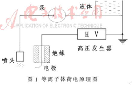 圖1所示為等離子體荷電原理圖,當在電極上施加一定的脈沖高壓時,窄脈沖電暈放電中產生的高能電子能使氣體電離成正、負離子,同時在空間電場中,由于高壓脈沖上升沿陡峭,電子可瞬間加速,而離子幾乎不加速。在這種放電等離子體中,電子溫度特別高,可形成大量的激發態分子,各種極富反應的自由基將會引發氣體分子電離。在電極附近,極性與電極極性相異的離子被電極吸附,與電極極性相同的離子受電排斥并在周圍形成離子區[1]。當藥液在泵或其他外力的作用下由噴頭霧化后形成霧滴并通過電離區與離子碰撞時,就把電荷傳給霧滴,使霧滴荷電。而霧滴又對離子產生排斥力,使充電速度下降,直至充電停止而達到飽和。